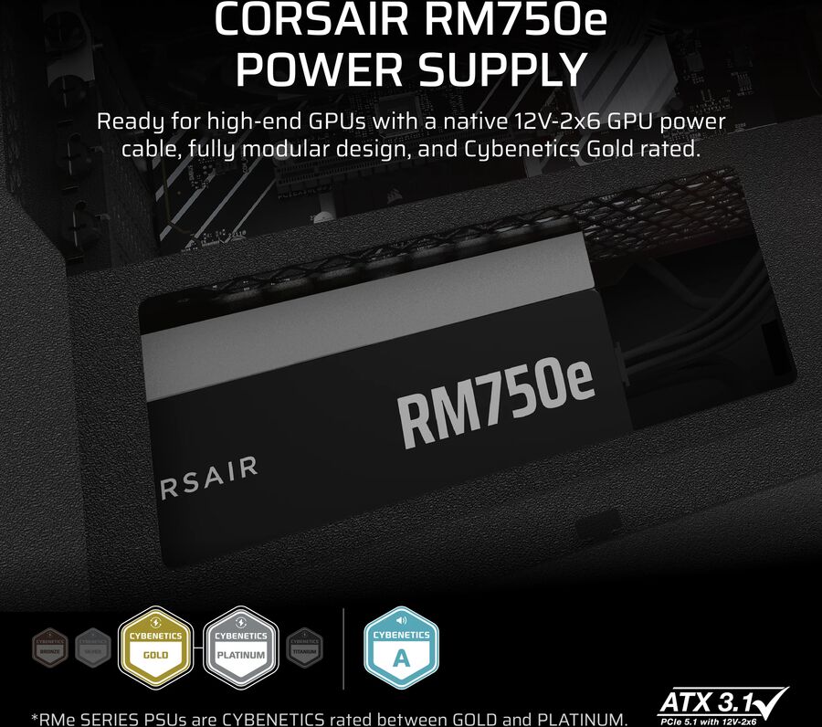 Corsair RM750e - 750W - ATX 3.1 - Full Modular, Cybenetics Gold ATX Power Supply